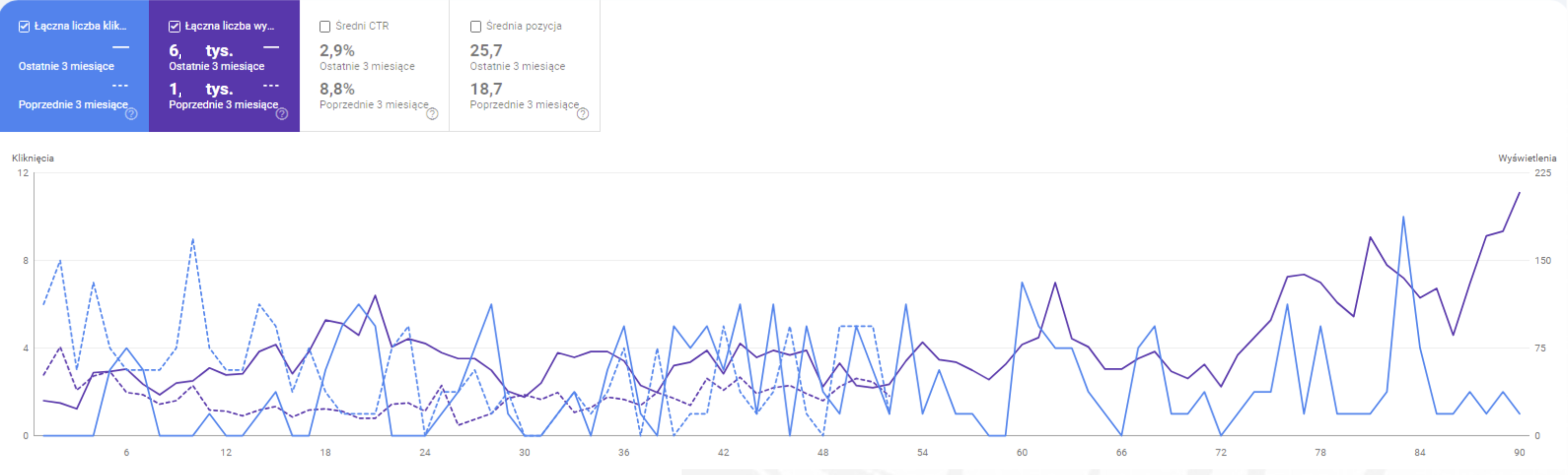 Na przestrzeni 3 miesięcy (w odniesieniu ostatniego kwartału do poprzedniego) 4krotnie zwiększyliśmy widoczność strony w wynikach wyszukiwania i podwoiliśmy liczbę wejść. W ujęciu miesięcznym rekordowo zwiększaliśmy wyświetlenia generując ponad 50% wzrosty na przestrzeni miesiąc do miesiąca.