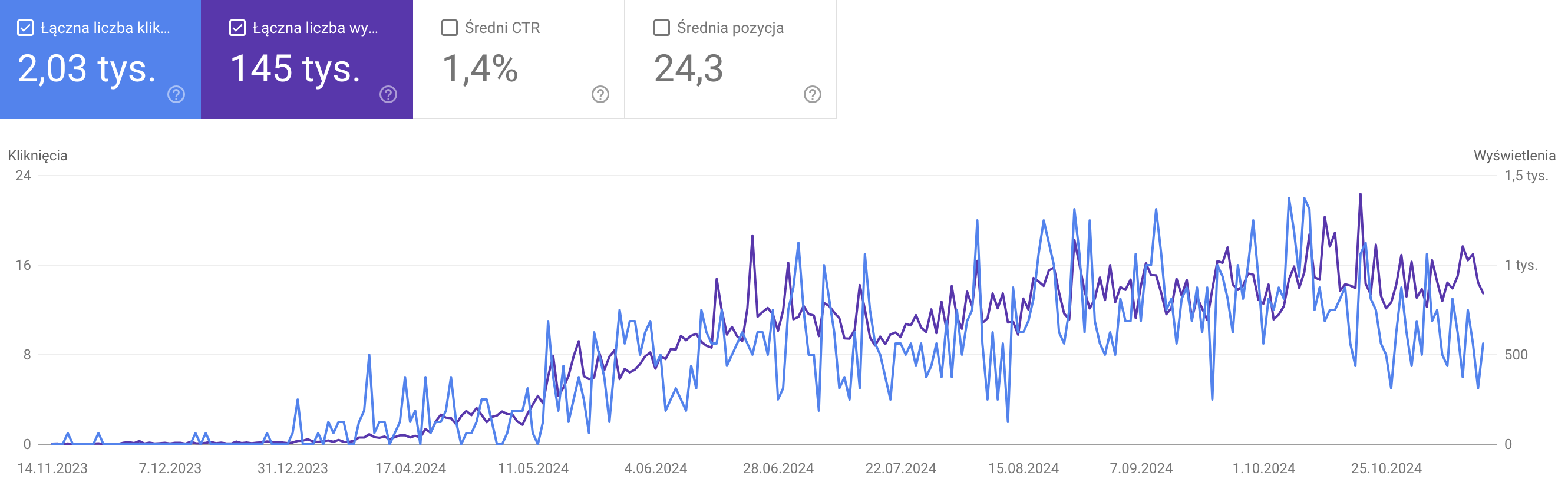 Wraz z nadejściem wiosny i rozpoczęciem sezonu rozpoczęliśmy prace nad uzyskaniem widoczności na frazy związane z zadaszeniami. Kilkumiesięczne działania przyniosły świetne wyniki – 145 tys. wyświetleń i 2 tys. wejść na stronę z wyników organicznych.